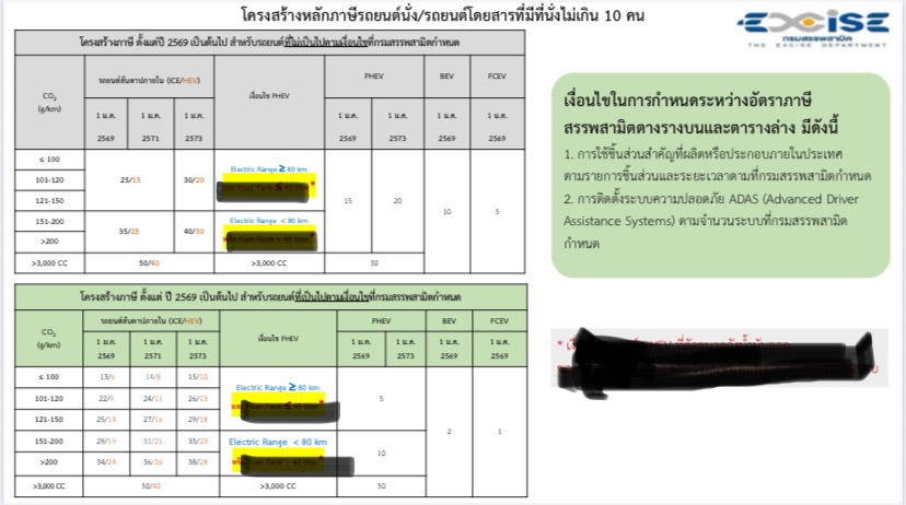 3. รถประเภท Plug-in Hybrid พิจารณาจากระยะทางการวิ่งด้วยพลังงานไฟฟ้า มากกว่า 80 กม. ต่อการประจุไฟฟ้า 1 คร้ัง เสีย 5% วิ่งได้น้อยกว่า 80 กิโลเมตร ต่อการประจุไฟฟ้า 1 คร้ัง เสีย 10% ส่วนขนาดเครื่องยนต์เกิน 3,000 ซี.ซี. จะเสียภาษีในอัตรา 30%