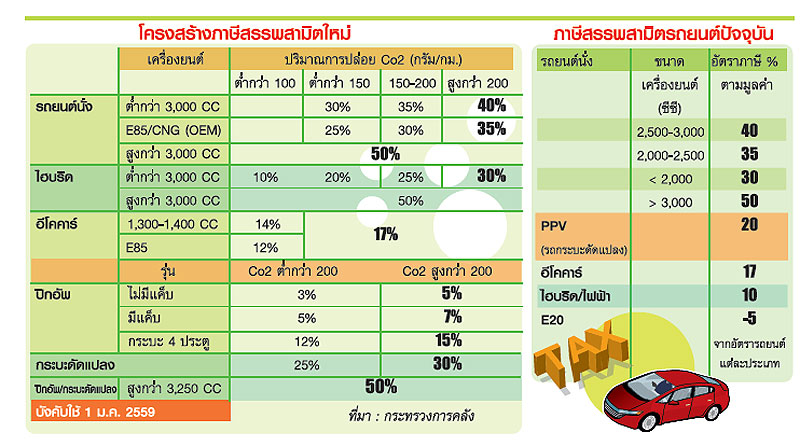 เริ่มจาก 1. รถยนต์สันดาปภายใน (ICE) เสียภาษี 13-37% แล้วแต่ปริมาณการปล่อย CO2 ในระดับใด จากเดิมเสีย 25-40% ส่วนรถที่มีขนาดเครื่องยนต์เกิน 3,000 ซี.ซี.จะเสียภาษีในอัตรา 40% จากเดิมที่เสีย 50%