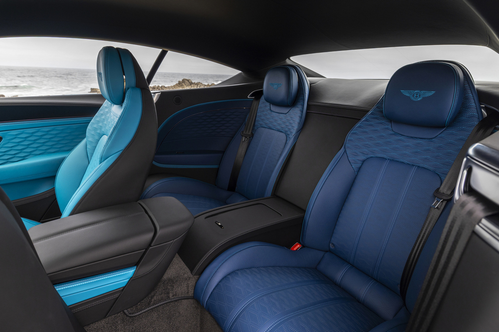 Mulliner’s Bespoke Studio ยังมอบความสมบูรณ์แบบด้วยการรังสรรค์การตกแต่งภายในห้องโดยสารด้วยวิธีการไล่เฉดสีแบบเดียวกันกับตัวถังภายนอก โดยในส่วนหน้าของห้องโดยสารได้รับการตกแต่งด้วยหนังเฉดสีฟ้า Topaz Blue แบบพิเศษบริเวณเบาะโดยสารคู่หน้า พวงมาลัย และแผงหน้าปัดที่เชื่อมไปยังคอนโซลกลาง และในส่วนของห้องโดยสารด้านหลังได้รับการปรับให้เข้ากับโทนสีเข้มในเฉดสีดำ Beluga พร้อมกับเบาะและประตูห้องโดยสารที่มีการตกแต่งด้วยเฉดสีฟ้า Dragonfly เพื่อเน้นการเดินเส้นด้ายและตะเข็บภายในห้องโดยสาร