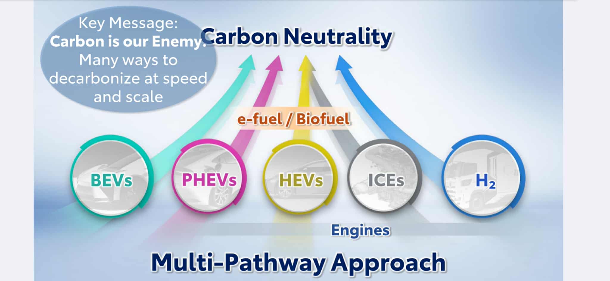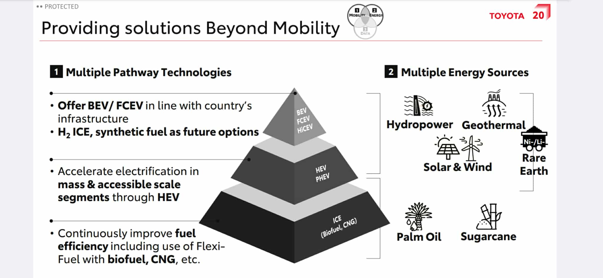 บริษัทยังให้ความสำคัญกับทุกพลังงงานเพื่อตอบสนองต่อความต้องการของลูกค้าที่แตกต่างกัน ไม่ว่าจะเป็นรถเครื่องยนต์สันดาปภายใน ซึ่งเป็นพื้นฐานสำคัญของรถ Hybrid ซึ่งอนาคตคาดว่าสัดส่วนของ Hybrid จะมีจำนวนเพิ่มมากขึ้น และจะรุ่นใหม่ๆ มาเพิ่มเติม นอกจากนี้ ยังมีรถยนต์เชื้อเพลิงทางเลือก เช่น CNG, ไฮโดรเจน, เชื้อเพลิงไบโอ โดยเฉพาะ CNG ยังเป็นทางเลือกหนึ่งที่ยังคงมีอยู่ตามหลัก Multiple Partway