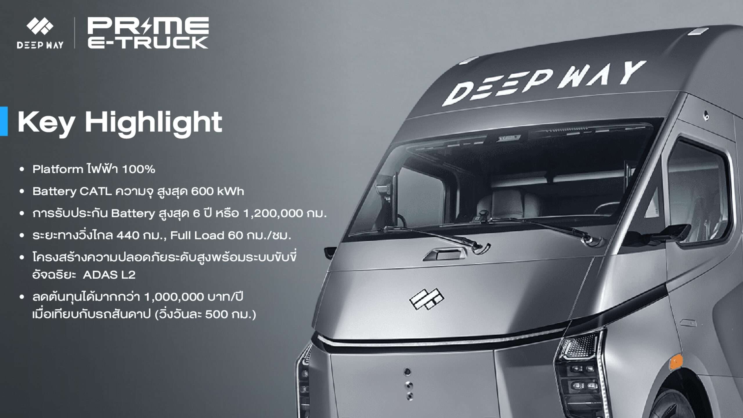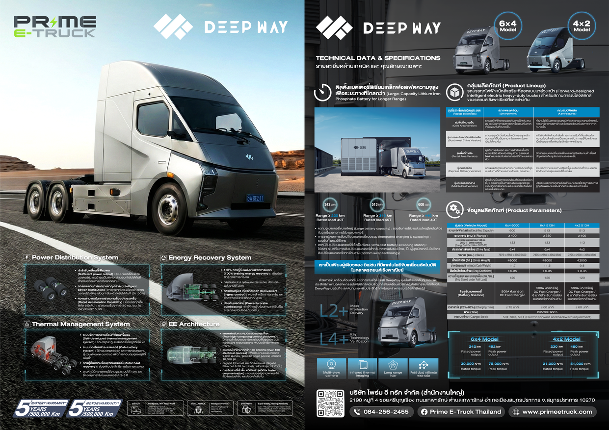 Prime E Truck จับมือ DeepWay เป็นผู้จัดจำหน่าย รถหัวลากไฟฟ้าอัจฉริยะ DeepWay แต่เพียงผู้เดียวในประเทศไทย พร้อมลงนามความร่วมมือพลิกโฉมโลจิสติกส์ไทยจากระบบดีเซลสู่ระบบพลังงานไฟฟ้า เปิดตัว DeepWay Star 6×4 ชู EV ระยะวิ่ง 440 กิโลเมตร (Full Load) พร้อมเทคโนโลยีแบตเตอรี่ CATL เป็นกลไกหลักลดต้นทุน–คาร์บอน เจาะตลาดขนส่งอาเซียน