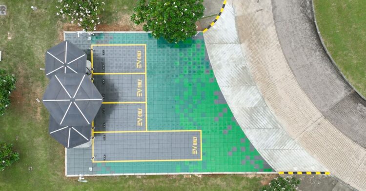 นอกจากหลังคาโพลีคาร์บอเนตรีไซเคิลจากโคเวสโตรแล้ว สถานีชาร์จแห่งนี้ยังใช้พื้นคอนกรีต EGAT AshNova ที่ผลิตจากเถ้าลอย (Fly Ash) ซึ่งเป็นวัตถุพลอยได้จากกระบวนการผลิตไฟฟ้าของโรงไฟฟ้าแม่เมาะ จ.ลำปาง ช่วยลดการใช้ซีเมนต์และลดการปล่อยก๊าซคาร์บอนไดออกไซด์จากกระบวนการผลิตซีเมนต์ได้สูงถึง 58% รวมถึงการใช้สีโพลียูรีเทนที่มีค่า VOC ต่ำจากบริษัท นิป -ปอนเพนต์ (ประเทศไทย) จำกัด