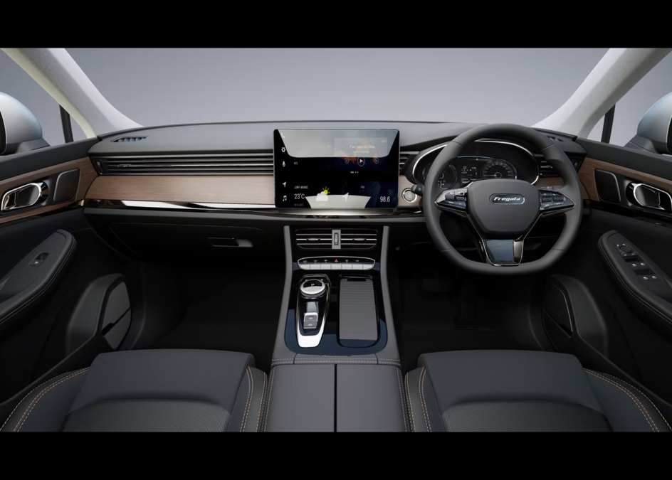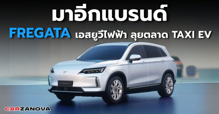 ซูมเข้าไปใกล้ๆ ปะยี่ห้อว่า Fregata ข้อมูลจากกูเกิลระบุว่าแบรนด์ Fregata เกิดจากความร่วมมือเชิงกลยุทธ์ระหว่าง Skyworth Auto (จีน), Wind God Automobile Co., Ltd. และ Sunlight Capital Co., Ltd. โดยมีจุดมุ่งหมายพัฒนารถยนต์ไฟฟ้าที่ครอบคลุมทั้ง R&D การผลิตและการขายผ่านเครือข่ายในประเทศไทยโดยเฉพาะกลุ่มแท็กซี่หรือภาคขนส่งทั่วไป