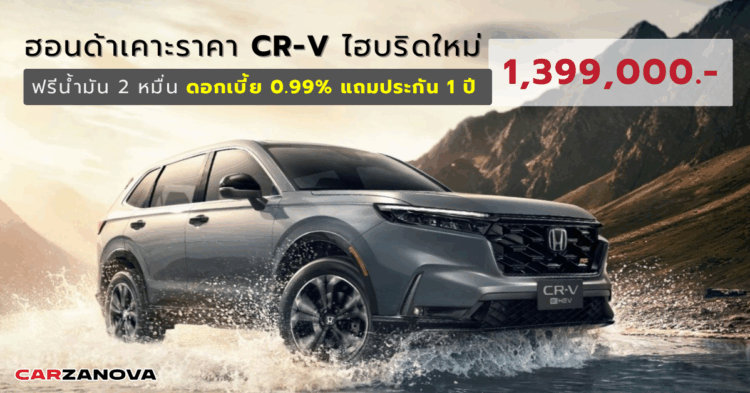 ครั้งแรกกับรุ่นย่อยใหม่ e:HEV HuNT กับดีไซน์อัปลุคสะท้อนไวบ์ที่แตกต่างอีกขั้น และรุ่นย่อย e:HEV RS ที่มาพร้อมระบบขับเคลื่อน 2 ล้อ เพื่อตอบโจทย์ทุกความต้องการลูกค้าอย่างลงตัว พิเศษรับฟรีบัตรเติมน้ำมันมูลค่า 20,000 บาท พร้อมรับดอกเบี้ย 0.99% และฟรีประกันภัย 1 ปี สำหรับลูกค้าที่ลงทะเบียนจองสิทธิ์ล่วงหน้าเพื่อเป็นเจ้าของ Honda CR-V e:HEV ใหม่ ทั้งในงานมอเตอร์เอ็กซ์โปและโชว์รูมฮอนด้าทั่วประเทศ ตั้งแต่วันที่ 7 พฤศจิกายน 2568 – 27 พฤศจิกายน 2568