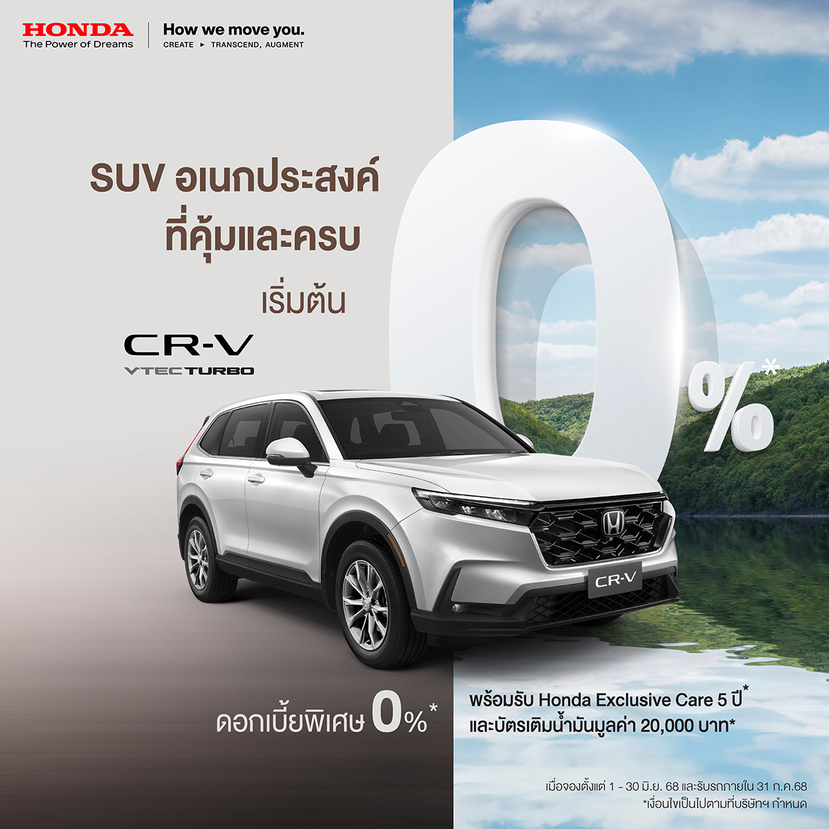CR-V Turbo รถ SUV ครอบครัวที่คุ้มและครบราคาเริ่มต้น 1,419,000 บาทรับข้อเสนอดอกเบี้ย 0% พร้อมรับ Honda Exclusive Care 5 ปีและรับเพิ่มบัตรเติมน้ำมันมูลค่า 20,000 บาทหรือเลือกผ่อนเบาๆรับฮอนด้าช่วยผ่อนเดือนละ 8,300 บาทจำนวน 12 เดือนรวมมูลค่า 99,600 บาทจ่ายค่างวดเริ่มต้นเพียง 6,423 บาท[คำนวณจากฮอนด้าซีอาร์–วีเกรด E เงื่อนไขดาวน์ 20% ผ่อน 7 ปีซึ่งเป็นค่างวดที่หักจากสิทธิพิเศษฮอนด้าช่วยผ่อนแล้ว]หรือเลือกดาวน์ต่ำเพียง 10%