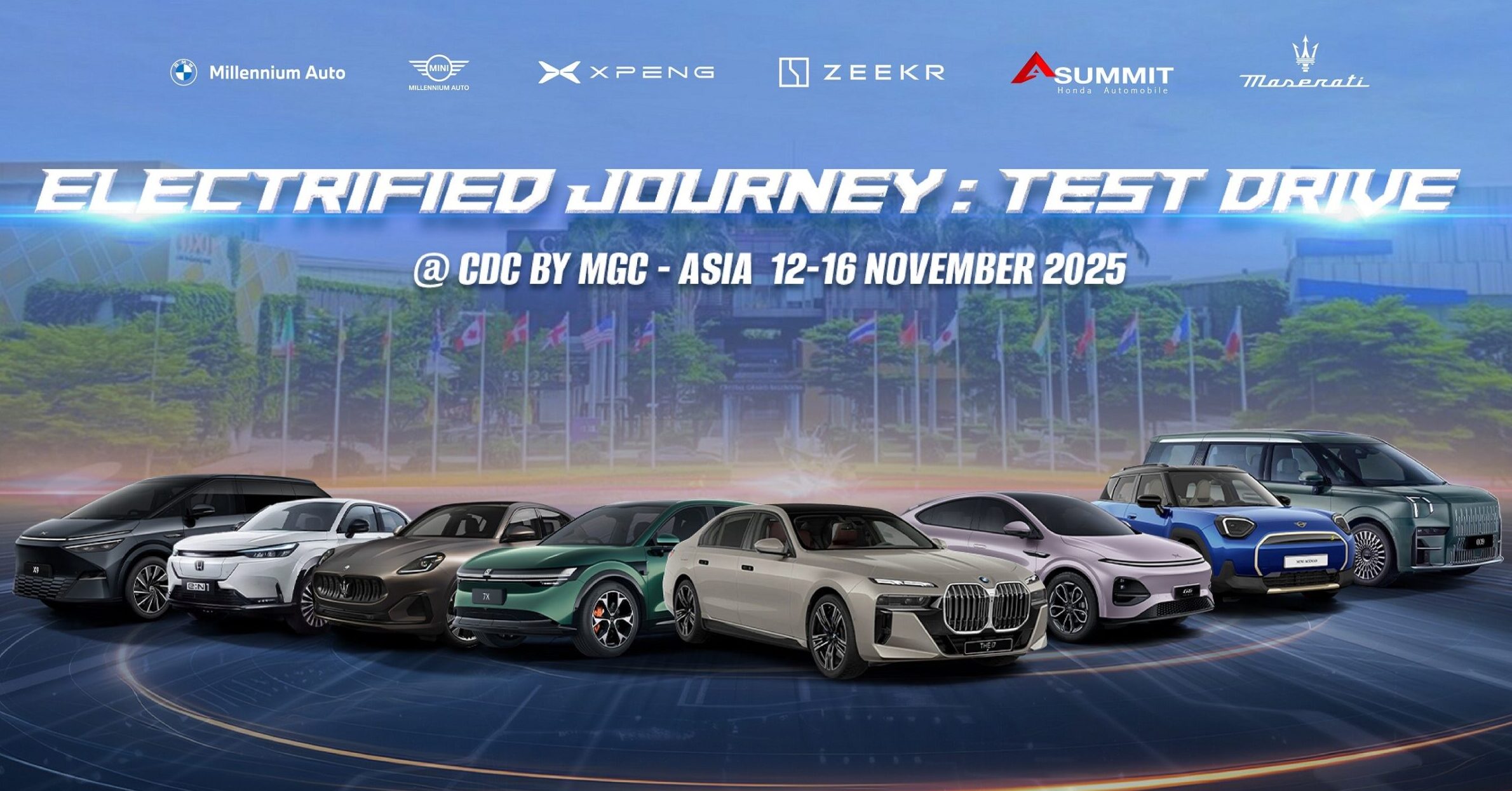 MGC-ASIA จัดกิจกรรมเพื่อผู้ชื่นชอบรถยนต์ไฟฟ้าโดยเฉพาะ กับงาน ‘Electrified Journey by MGC-ASIA’ ยกทัพยนตรกรรมไฟฟ้าระดับพรีเมียมลักชัวรี่ในเครือฯ และแบรนด์พันธมิตร รวม 7 แบรนด์ มากกว่า 15 รุ่น มาจัดแสดง พร้อมเปิดโอกาสให้สัมผัสและทดลองขับในสนามเฉพาะกิจ มาพร้อมข้อเสนอสุดพิเศษทุกรุ่น ระหว่างวันที่ 12-16 พฤศจิกายน 2568 ที่ คริสตัล ดีไซน์ เซ็นเตอร์ (CDC) เลียบทางด่วนเอกมัย-รามอินทรา