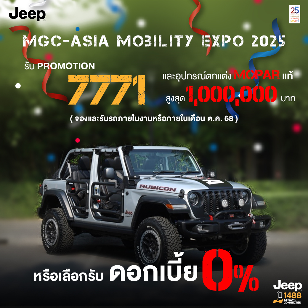 - รับโปรโมชั่น 7771 และอุปกรณ์ตกแต่ง Mopar แท้ สูงสุดมูลค่า 1,000,000 บาท* หรือ ดอกเบี้ย 0% พร้อมสัมผัสประสบการณ์ใหม่กับกิจกรรม Jeep Matcha Experience Brew Your Freedom*
