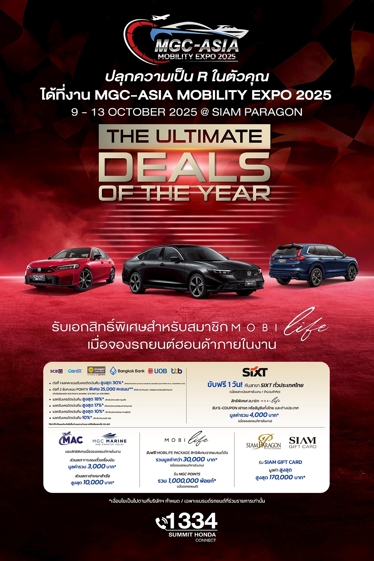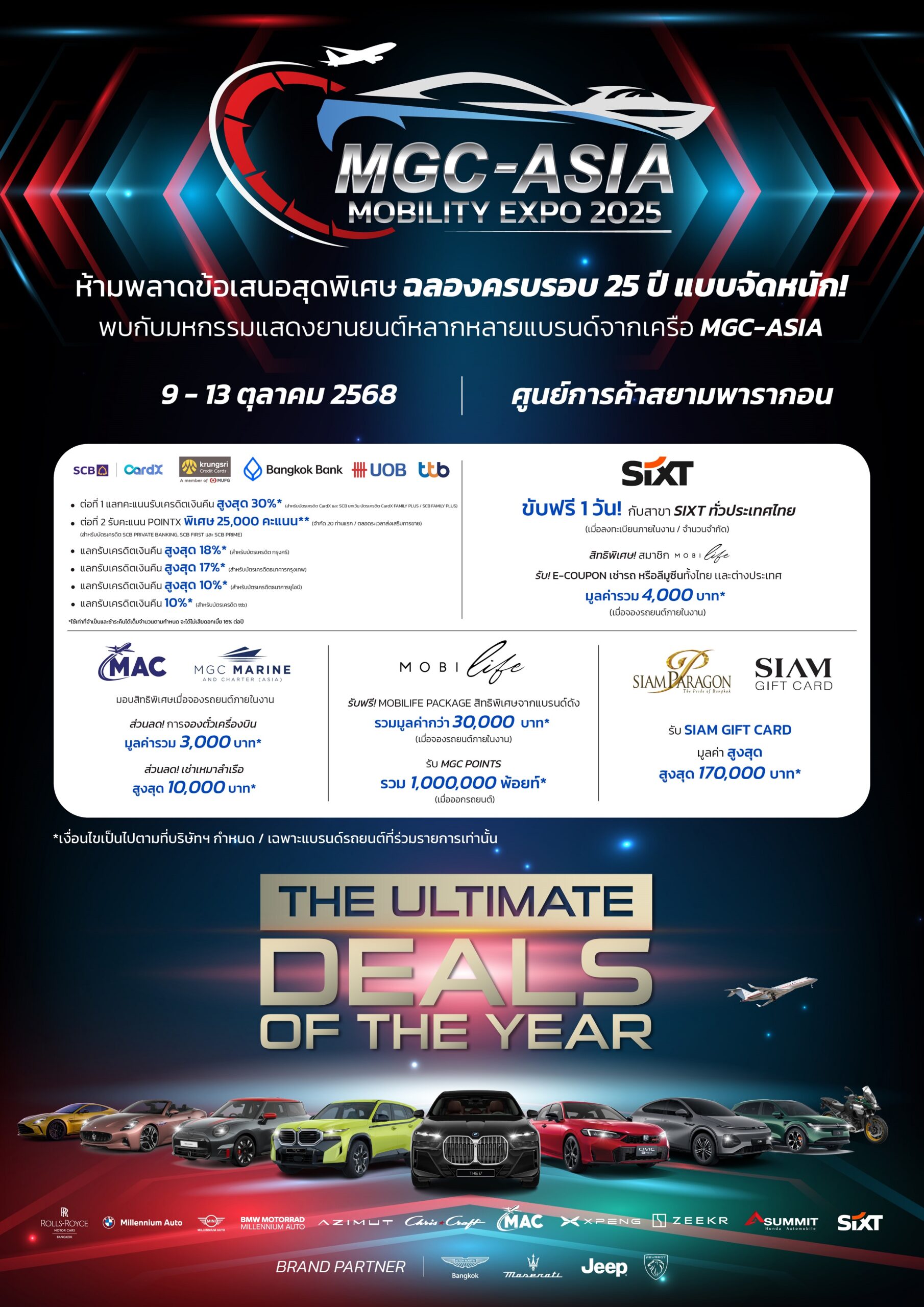 บริษัท มิลเลนเนียม กรุ๊ป คอร์ปอเรชั่น (เอเชีย) จำกัด (มหาชน) หรือ MGC-ASIA ผู้นำธุรกิจไลฟ์สไตล์โมบิลิตี้ครบวงจร จัดงานใหญ่ประจำปี ‘MGC-ASIA MOBILITY EXPO 2025’ ยกทัพยนตรกรรมในเครือ ครบทุกแบรนด์ จัดแสดงให้ลูกค้าได้สัมผัสอย่างใกล้ชิด พร้อม ‘The Ultimate Deals of the Year’ ข้อเสนอพิเศษแห่งปีที่ยากจะปฏิเสธ ระหว่างวันที่ 9-13 ตุลาคม 2568 ที่ศูนย์การค้าสยามพารากอน