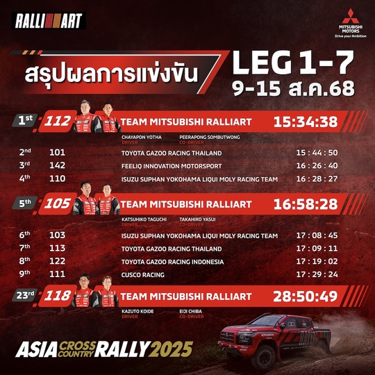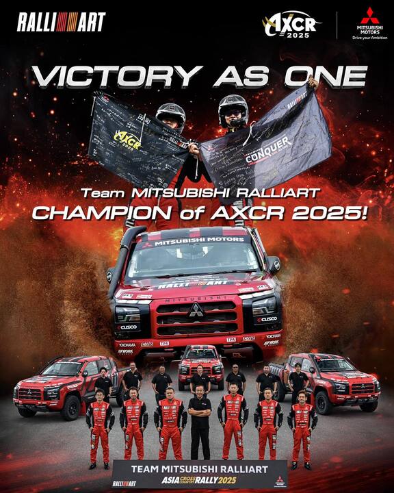 มิตซูบิชิ มอเตอร์ส ประกาศความยิ่งใหญ่ในวงการมอเตอร์สปอร์ตเอเชียอีกครั้ง เมื่อทีมมิตซูบิชิ แรลลี่อาร์ต ซึ่งได้รับการสนับสนุนด้านเทคนิคจาก มิตซูบิชิ มอเตอร์ส (ประเทศญี่ปุ่น) คว้าแชมป์รายการแข่งขันเอเชีย ครอสคันทรี แรลลี่ 2025 (AXCR 2025) ซึ่งจัดขึ้นที่ประเทศไทย ตั้งแต่วันที่ 8 – 16 สิงหาคมที่ผ่านมา โดยใช้รถกระบะไทรทัน1 (สเปก T1 หรือรถครอสคันทรีดัดแปลง) เข้าแข่งขันบนเส้นทางสุดหฤโหด รวมระยะทางกว่า 2,316.32 กิโลเมตร ซึ่งรวมถึงเส้นทาง Special Stage (SS)2 กว่า 1,002.95 กิโลเมตร