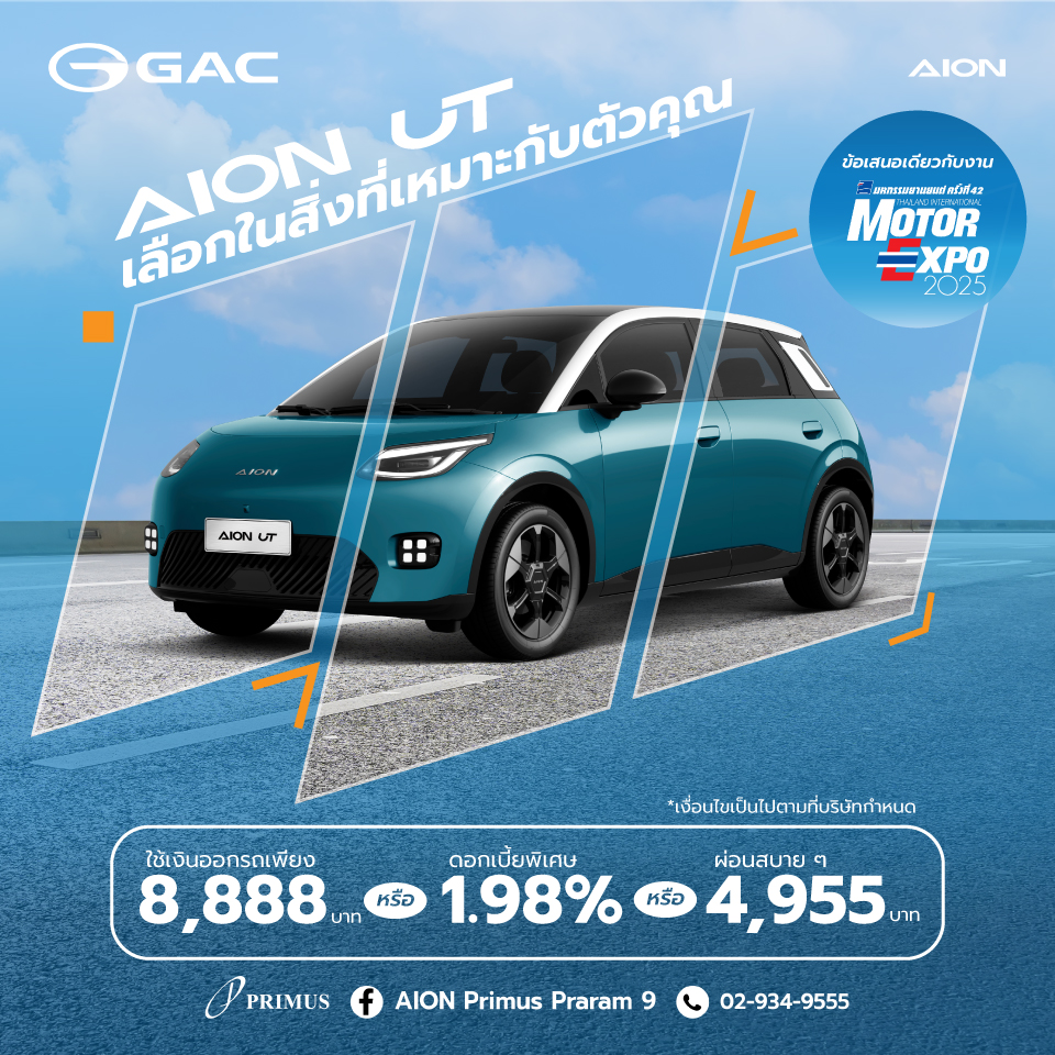 – GAC AION UT ราคาเพียง 469,900 บาท, ดาวน์เริ่มต้น 8,888 บาท รับประกันแบตเตอรี่และมอเตอร์ไฟฟ้าตลอดอายุการใช้งาน