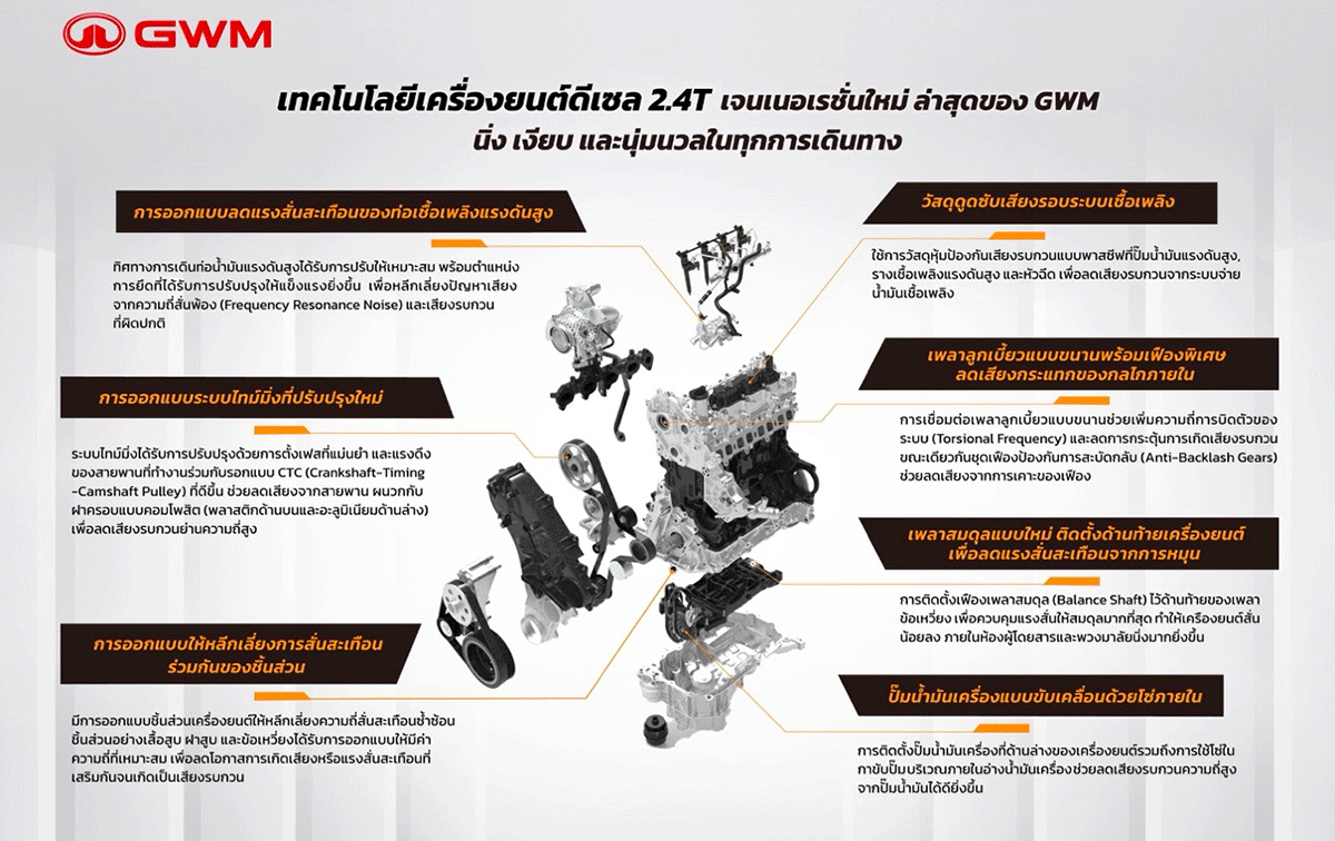 - การออกแบบระบบไทม์มิ่งที่ปรับปรุงใหม่ (Optimized Timing System Design) GWM มีการออกแบบระบบไทม์มิ่งใหม่ทั้งความตึงสายพานและลูกรอกที่มีการปรับให้เหมาะสม เพื่อช่วยลดเสียงรบกวนของสายพานในขณะทำงาน นอกจากนี้ ฝาครอบเครื่องยนต์ที่ทาง GWM ใช้ ทำจากวัสดุผสมคือ ด้านบนทำจากพลาสติกที่มีความยืดหยุ่น และด้านล่างทำจากอะลูมิเนียมที่ช่วยดูดซับเสียงสะท้อน เหมาะกับการลดเสียงความถี่สูงที่อาจกระจายเข้าห้องโดยสาร เช่น เวลาขับในอุโมงค์หรือลานจอดรถใต้ดิน ด้วยการออกแบบพิเศษนี้ส่งผลให้ผู้ขับขี่ได้ยินแค่เสียงล้อกับถนน ไม่ได้ยินเสียงเครื่องยนต์สะท้อนกวนใจในระหว่างขับขี่