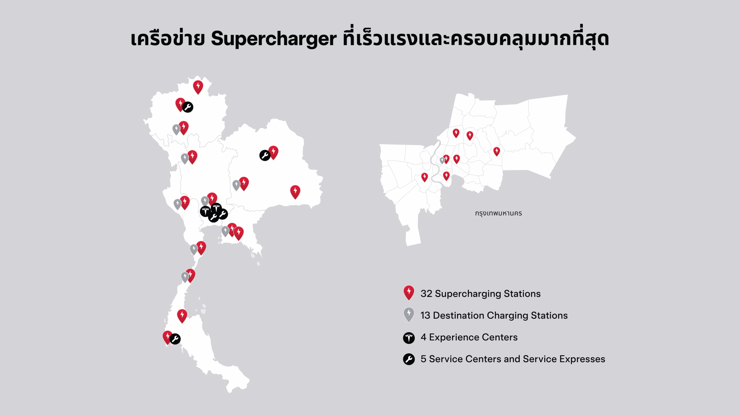 ด้วยการเพิ่มสถานีใหม่ล่าสุดนี้ ทำให้ปัจจุบัน Tesla มีสถานี Supercharger รวมทั้งหมด 32 แห่ง (193 หัวชาร์จ) และ 13 สถานี Destination Charging (52 หัวชาร์จ) ทั่วประเทศไทย นอกจากนี้ ยังมีครัวเรือนมากกว่า 10,000 ครัวเรือน ที่ติดตั้งเครื่องชาร์จติดผนังที่บ้านแล้ว การขยายเครือข่ายการชาร์จอย่างต่อเนื่องครอบคลุมทั่วประเทศ ช่วยส่งมอบประสบการณ์ที่ดีมากยิ่งขึ้นให้แก่ผู้ใช้งาน Tesla ทุกคน ในทุกรูปแบบการใช้งาน ไม่ว่าจะเป็นที่บ้าน ระหว่างการเดินทางในชีวิตประจำวัน หรือขับรถทางไกล