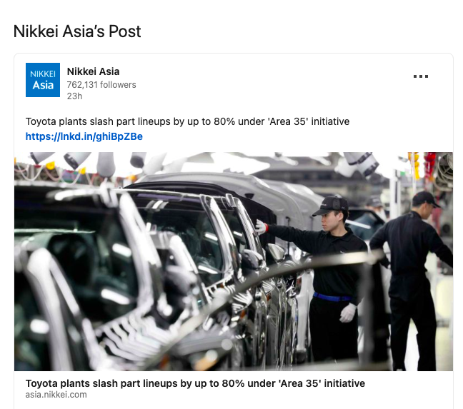 วันก่อนนิกเคอิเอเชีย (Nikkei Asia) รายงานว่าโตโยต้ามอเตอร์มีแผนปรับปรุงด้านการผลิตรถยนต์ให้มีประสิทธิภาพโดยจะครอบคลุมโรงงาน 18 แห่งเป้าหมายเพื่อเพิ่มผลผลิตโดยใช้หลักไคเซ็น (Kaizen) ในการพัฒนาอย่างต่อเนื่องและรักษาความสามารถในการแข่งขันภายใต้โปรเจ็ก TOYOTA Area 35