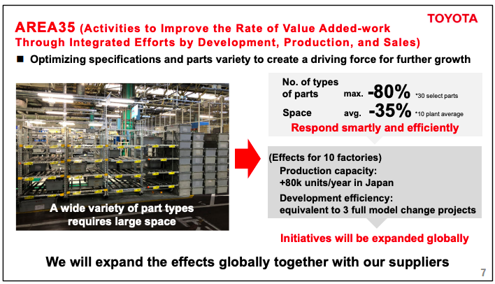โปรเจ็ก Area 35 เริ่มมาตั้งแต่ปี 2023 โดยวางเป้าหมายเพื่อลดการใช้พื้นที่ในโรงงานลง 35% และลดจำนวนสต็อกชิ้นส่วนอะไหล่ที่ไม่จำเป็นราว 20% คำถามของ Area 35 จะมุ่งไปที่การจะใช้ทรัพยากรทั้งหมดที่ใช้ในการผลิตรถยนต์ 10 ล้านคันอย่างไรให้มีประสิทธิภาพยกตัวอย่างให้เห็นชัดๆคือ โรงงานผลิตรถยนต์มีพาร์ตนัมเบอร์มากมายเช่นชุดสายไฟสำหรับแผงหน้าปัดมีมากกว่า 100 เบอร์แต่ก็มีจำนวนไม่น้อยที่ไม่เคยถูกนำใช้งานเลย