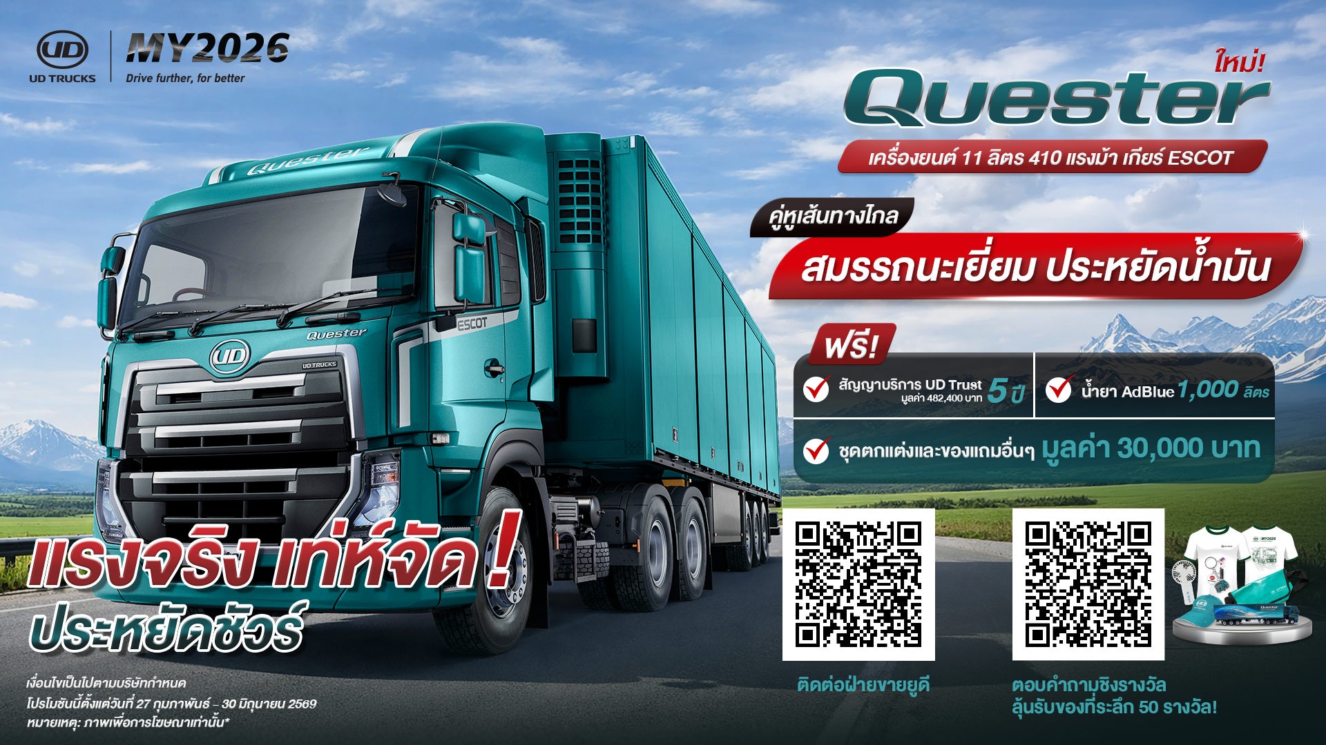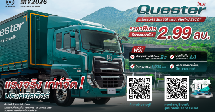 UD Trucks เปิดตัว Quester รุ่นใหม่ MY2026 เครื่องยนต์ 8 ลิตร จัดเต็มพร้อมเกียร์ ESCOT และโปรโมชั่นสุดคุ้ม โดยมาพร้อมมาตรฐานยูโร