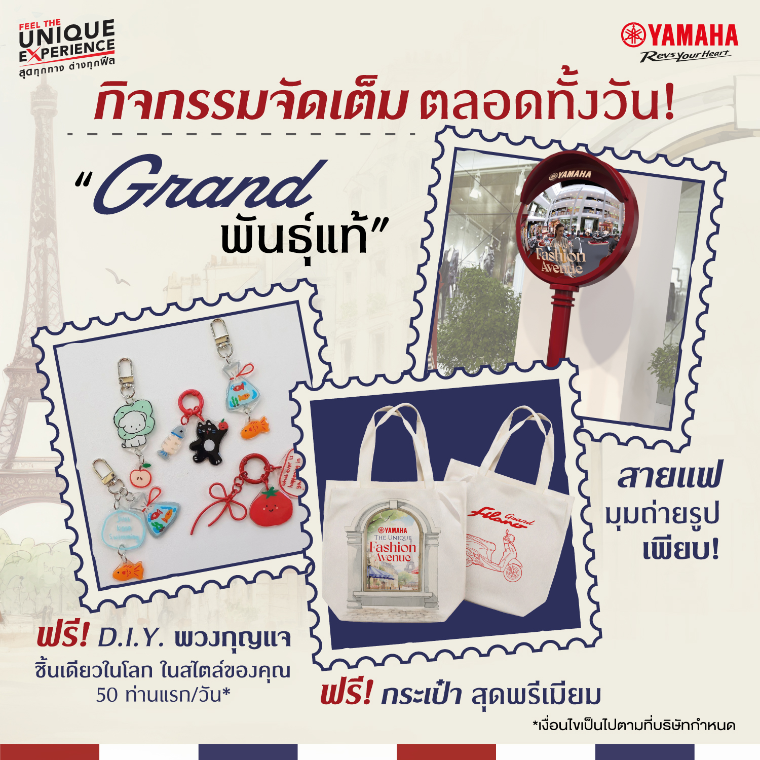ภายในงาน อัดแน่นไปด้วยกิจกรรมความบันเทิงสุดสร้างสรรค์ อาทิ เกมสนุก ๆ พร้อมไอศกรีมรส “GRAND FILANO”, กิจกรรม DIY พวงกุญแจสุดเอ็กซ์คลูซีฟในแบบฉบับของตนเอง และมุมถ่ายภาพ Check-in เพื่อรับกระเป๋าพรีเมียมที่มีเฉพาะในงานนี้เท่านั้น นอกจากนี้ยังจัดแสดงรถจักรยานยนต์ YAMAHA GRAND FILANO HYBRID และรถออโตเมติกสุดฮิตครบรุ่น ให้ผู้เข้าชมได้ใกล้ชิดอย่างเต็มอิ่ม